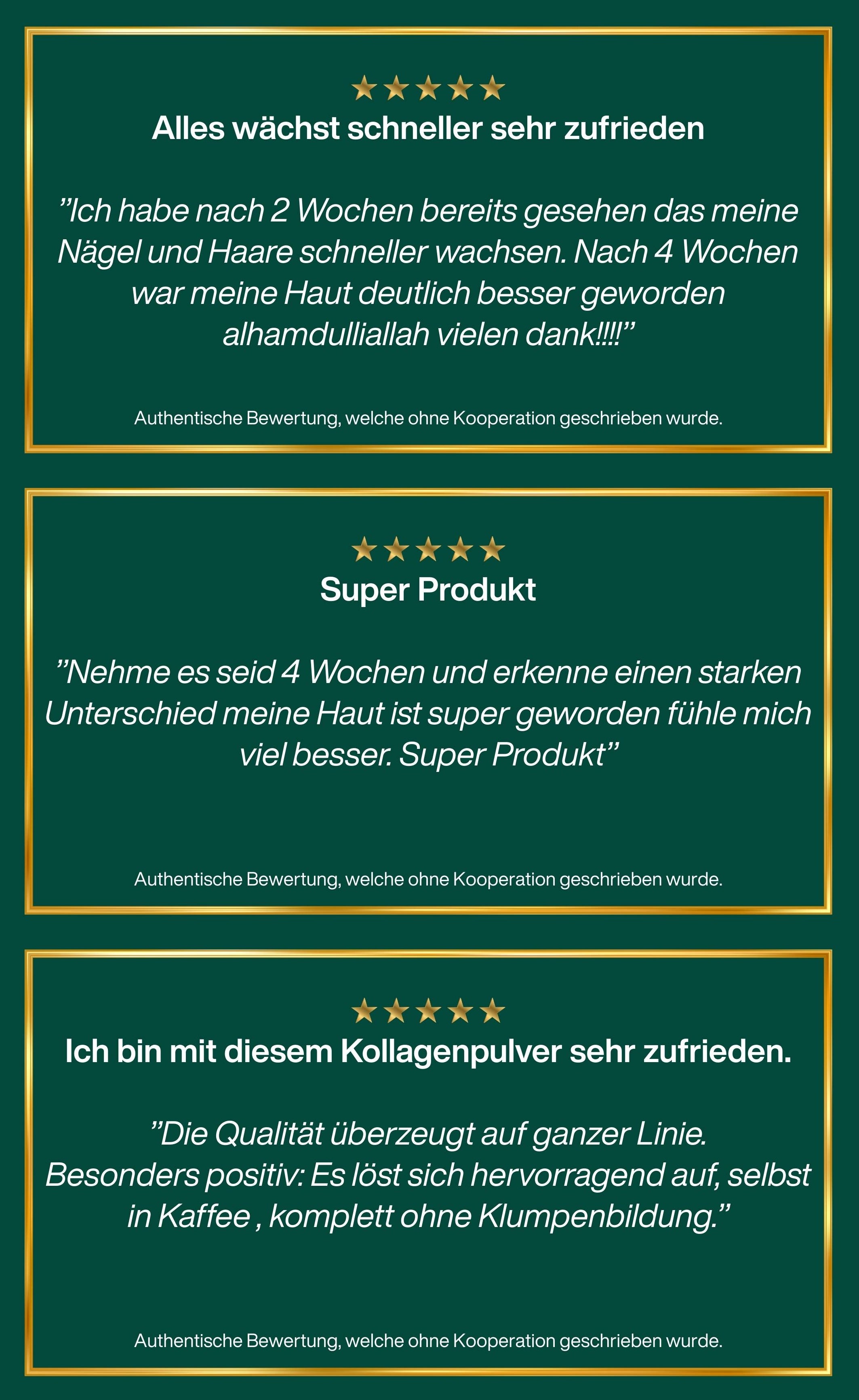 Nach einigen Wochen habe ich gemerkt, dass meine Haut frischer aussieht, meine Nägel stärker geworden sind und auch meine Gelenke sich besser anfühlen. Besonders positiv finde ich die Transparenz und die Halal-Zertifizierung, die mir ein gutes Gefühl geben.
